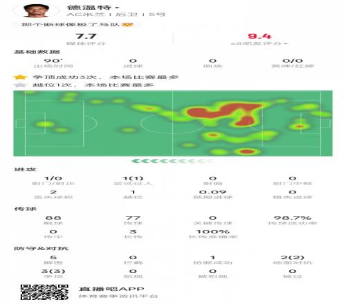 德温特本场数据:5次解围+1次抢断,5次对抗全部成功,获评7.7分