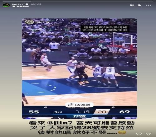林书豪在社媒上转发自己在新北国王的集锦并写道:“这几天真的有很多情绪,12/28跟国王庆祝生涯。”好友周杰伦转发并写道:“看了林书豪当天可以会感动哭了,大家28号去支持然后对他唱说好不哭...”