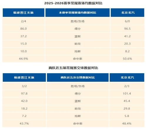 2025-2026CBA联赛常规赛第七轮,福建晋江文旅男篮将继续坐镇主场,迎战开局6战全胜的北京北汽男篮,直面劲敌,成为检验主队近期状态回升的关键一战。主队在上轮比赛中,以97-84击败广州终结连败,场均失分提升至88.8分,排名联赛中游。但场均得分86分、三分命中率29.7%的短板仍存;而对手北京北汽男篮以全胜战绩高居榜首,场均得分96.5分、失分仅76.3分,净效率值+13.8领跑联盟,攻防两端的统治力堪称联盟顶级。