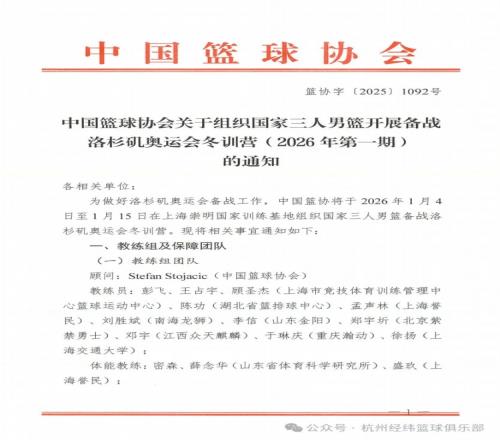 近日,中国篮球协会公布国家三人男篮备战洛杉矶奥运会冬训营名单,我俱乐部多人入选,其中,管理保障组1人(孙毅)、运动员3人(王昊天、戴江旭、游毅超)
