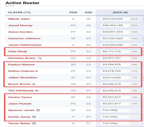 纳吉本赛季薪资818万,是本场出战的掘金球员中工资最高的一位