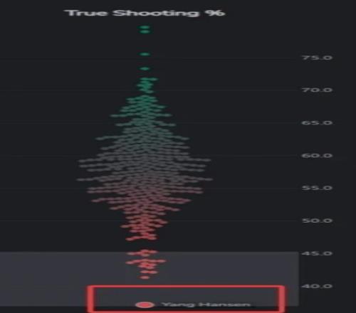 杨瀚森本赛季真实投篮命中率是全联盟最低档(39.5%,虽然样本较小,总排名474位,球员总数约为498),低于克里斯·保罗(同样样本较小)和布朗尼。