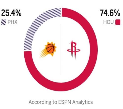 今天,ESPN预测本场胜率,火箭74.6%占据优势,太阳25.4%。