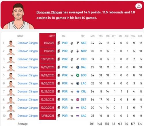 克林根最近十场比赛场均14.5+11.5