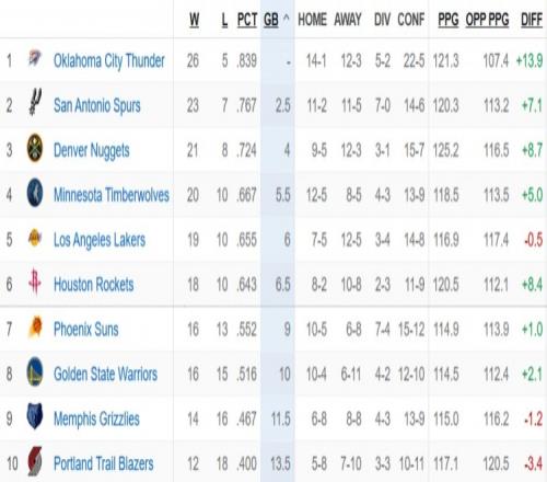 值得一提的是,湖人目前的最新场均净胜分为-0.5分,是联盟所有胜率至少五成球队中唯一场均净胜分为负的球队。