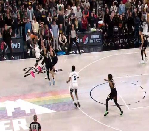 加时赛最后30秒,掘金131-128领先3分,约基奇防守时主动与爱德华兹的手臂发生接触,影响了对方的传球,此为漏判。