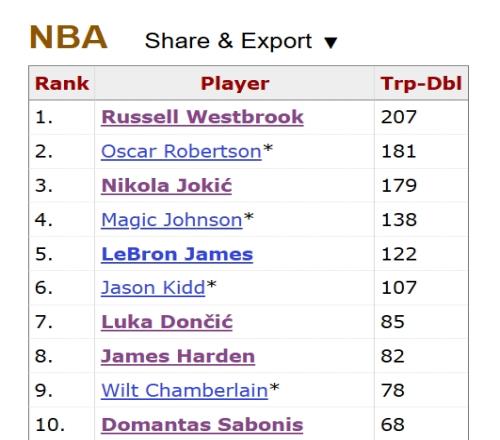 约基奇生涯三双数距离历史第二的大O仅差1个,而距离历史第一的威少也仅差27个!