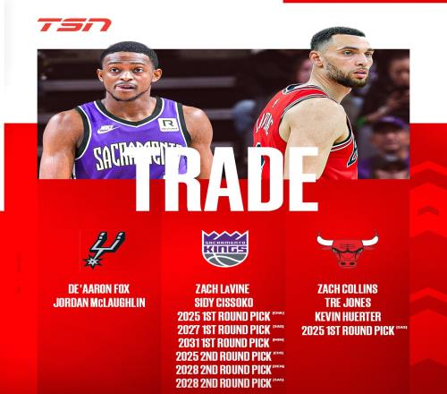 2月3日,公牛、国王和马刺达成三方交易,其中马刺得到福克斯、麦克劳林;国王得到拉文、西索科、三个首轮(来自2025黄蜂前14保护、2027马刺无保护、2031森林狼无保护)、三个次轮(2025公牛、2028掘金、回收2028自己);公牛得到扎克-科林斯、特雷-琼斯、许尔特、从马刺回收自己25年首轮签。