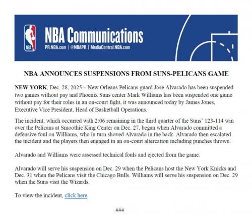体育播报12月29日宣 NBA今日官宣,对昨日太阳VS鹈鹕比赛中打架的阿尔瓦拉多以及马威禁赛,其中阿尔瓦拉多被禁赛2场,马威被禁赛1场。