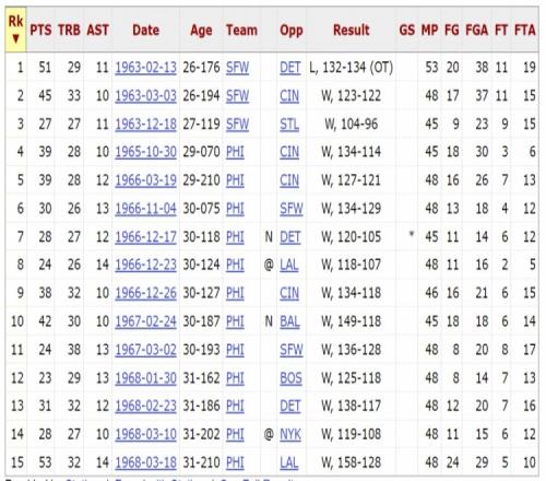 1961年11月9号,圣路易斯老鹰118比124不敌湖人。佩蒂特出战48分钟,25投10中,9罚8中,砍下28分25篮板10助攻。