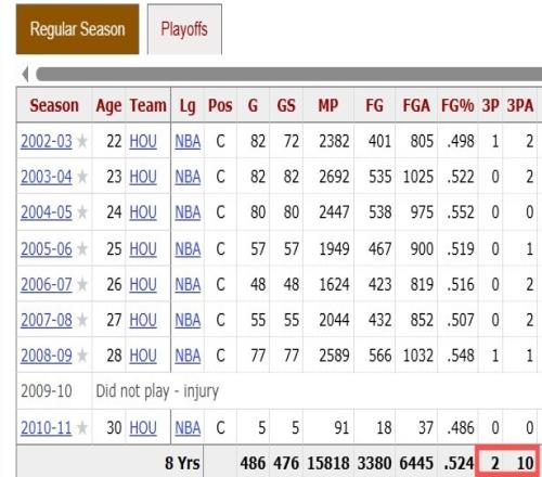 姚明NBA生涯出战486场比赛,一共只出手过10次三分,10投2中!