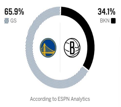 今天,ESPN预测本场胜率,勇士胜率65.9%,篮网胜率34.1%。