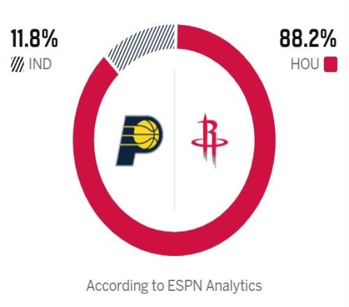 今天,ESPN预测本场比赛胜率,火箭88.2%占据大优势,步行者11.8%。