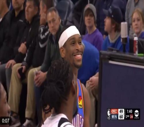 雷霆vs森林狼,狼队球迷嘲讽亚历山大:罚球机器(Free throw merchant)!罚球机器!,亚历山大自己也笑了。
