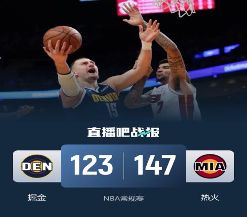 此役一上来双方迅速陷入僵持,约基奇得分组织一把抓,穆雷和哈达威续上火力,鲍威尔里突外投强势回应,中段热火一波11-0确立优势,首节结束时热火领先12分,次节回来,约基奇连投带传率队轰出12-0攻击波,掘金一度实现反超,但约基奇被队友琼斯误伤离场,半场战罢,两队战成63平。易边再战后双方互不设防拉开对攻,热火愈战愈勇夺回优势,三节结束后热火领先11分,末节上来,热火延续火力将分差越拉越大,掘金换上替补提前缴械,最终热火147-123击败掘金迎来三连胜,同时送给对手两连败。