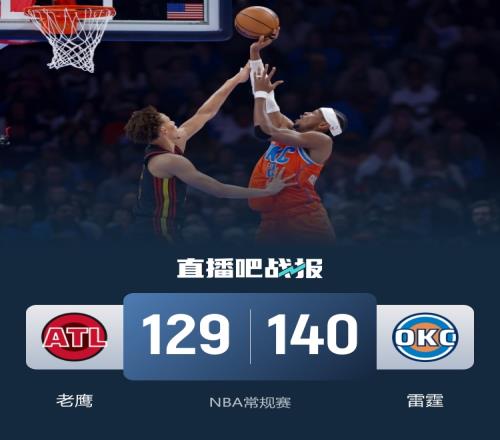首节对决雷霆一如往常打出犀利进攻并在首节拿下35分,但老鹰这边同样手热,他们拉锯大半节后扭转局势并依靠沃克最后的超远压哨三分拿到3分领先;次节双方继续保持着高效进攻,雷霆作为联盟最顶尖的进攻球队却在拉锯战中占不到任何便宜,奥孔武火力全开半场拿下20分对飚亚历山大的21分,老鹰顶住压力带着4分优势进入下半场。休息归来雷霆找到状态轰出28-11的攻势拉开比分,但他们防守端依旧无法限制老鹰,末节老鹰紧咬比分保留希望,不过最后时刻以霍姆格伦为首轰进三记三分拉开两位数分差锁定胜局。最终,雷霆主场击败老鹰拿下比赛。