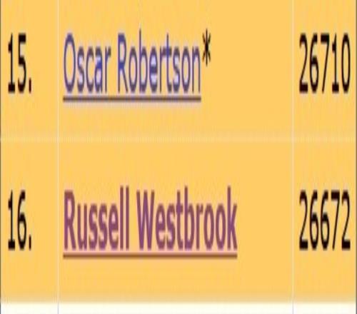 目前,国王球星威少生涯总得分为26672分,距离前一位的奥斯卡·罗伯特森仅差38分,后者也是NBA历史控卫得分王。