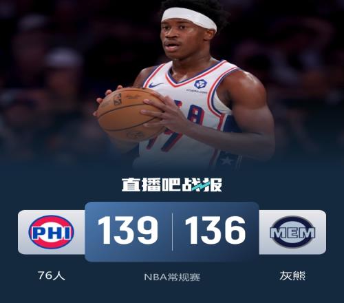 比赛开始,灰熊全员发力率先打出17-7不错开局,调整过后马克西、恩比德和埃奇库姆相继打成咬住比分,随后双方对飙,灰熊单节7记三分领先6分,次节乔治联手恩比德带队一度反超,但科沃德连续攻筐上双回应,马克西高难度拉杆三分助76人半场打成72平。下半场,灰熊上来12-4重新拉开比分,但76人连续抢断反击回应15-4攻击波直接反超,三节76人领先3分,末节莫兰特连续取分带队咬住,但埃奇库姆攻防两端发力,连续大帽和高难度冲筐重新拉开领先,关键时刻莫兰特再追平,韦尔斯和阿尔达马连续绝杀三分不中,双方进入加时。加时赛,灰熊先拿到领先,马克西接连高难度回应,莫兰特拉杆上篮再追平,埃奇库姆绝杀三分,科沃德绝平三分不中,最终76人加时139-136险胜灰熊。