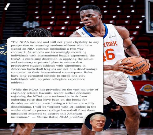 NCAA不会,也从未给予任何已签署NBA合同(包括双向合同)的潜在或返校学生运动员参赛资格。随着各校越来越多地招募拥有国际联赛经验的球员,NCAA在执行‘实际且必要开支’的相关章程时将更加审慎,以确保拥有美国篮球联赛经验的潜在学生运动员不会在与国际球员的竞争中处于劣势。现行规则早已允许学校在学期中途招收并安排此前无大学经历的球员参赛。