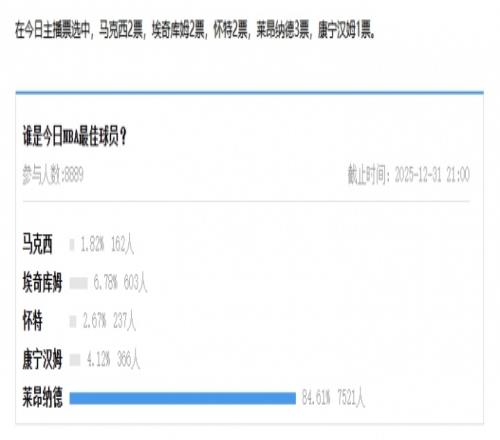 在今日主播票选中,马克西2票,埃奇库姆2票,怀特2票,莱昂纳德3票,康宁汉姆1票。