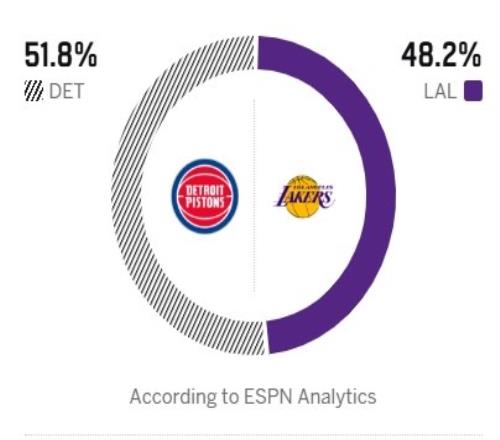 ESPN预测本场胜率:湖人48.2%,活塞51.8%。