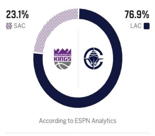 ESPN预测本场胜率:快船高达76.9%,国王23.1%。