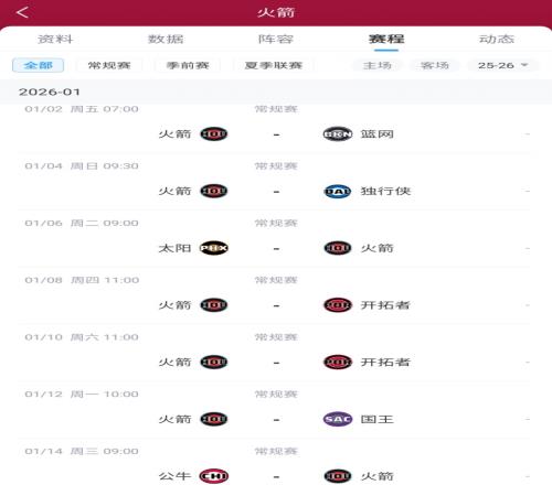 2026年开年的前7场比赛,火箭将对阵6支胜率不足五成的球队(2主5客,仅太阳超过五成),并且在此期间他们没有背靠背。