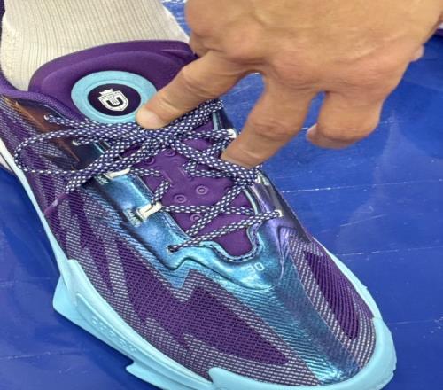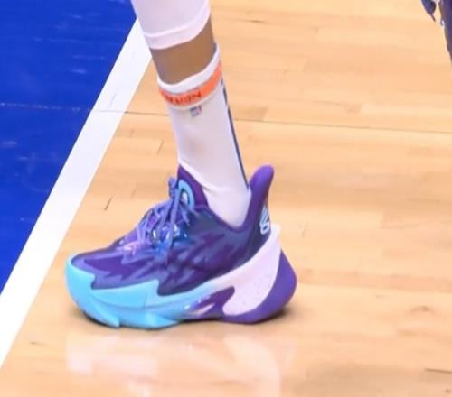 本场比赛,库里赛前热身环节,穿回了UA,上脚了库里品牌的旗舰鞋款Curry Series 7。这个配色是为三人女子篮球联赛Unrivaled做的PE鞋款。