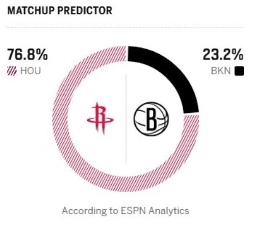 今天ESPN给出了本场比赛的胜率预测,火箭高达76.8%,篮网只有23.2%。