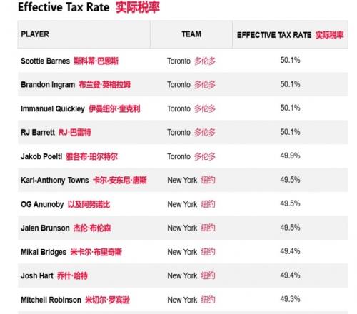 据统计,猛龙球星斯科蒂·巴恩斯本赛季工资3866.2万美元,税后只有1927.6万美元,实际税率占比达到50.1%(联盟最多),猛龙多位球员实际税率也是如此,其次是尼克斯多位球星,具体如下: