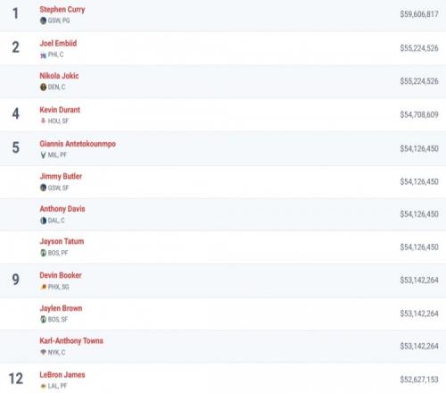 本赛季税前薪资排行如下(库里5960万排名第一):