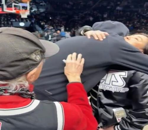 赛前,杜兰特与篮网死忠老球迷Mr Whammy亲切交流,并拥抱了蔡老板夫人吴明华。