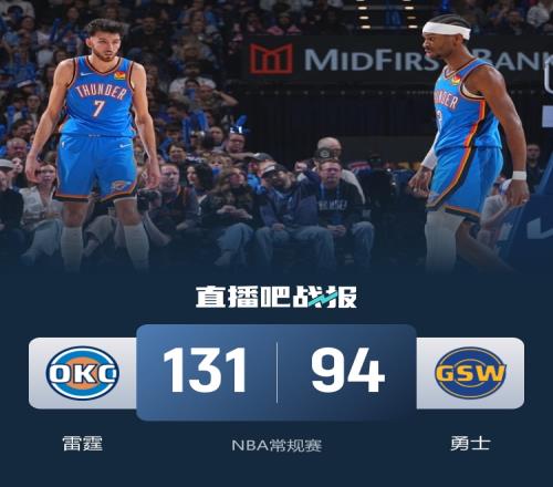 雷霆(30-5):亚历山大30分1板7助、霍姆格伦15分15板4助4帽、卡尔森15分11板2助2断、维金斯15分3板2助、杰伦·威廉姆斯12分6板2助、多特11分3板、米切尔11分2板6助2断、扬布拉德9分1板1助、乔5分2板4助、卡鲁索4分1板2助、肯里奇·威廉姆斯2分3板3助、华莱士2分3板1助2断