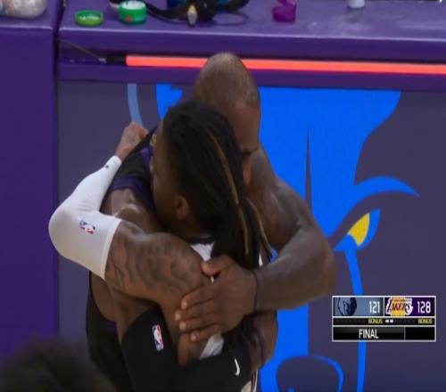 湖人力克灰熊!终场后詹姆斯留在场内拥抱莫兰特!