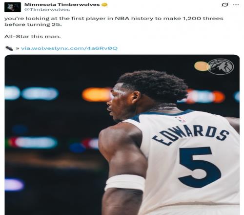 目前,爱德华兹投进3记三分,他的三分命中数突破1200记,25岁以前NBA首人。