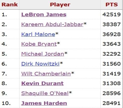 本场比赛过后,杜兰特生涯总得分来到31342分,距离超越张伯伦还差78分。