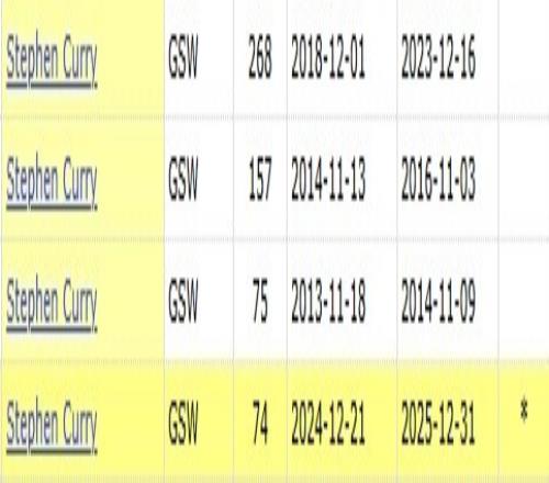 勇士官方晒出数据,库里已经连续75场比赛至少投进1个三分,这也是他生涯第4次做到这点!