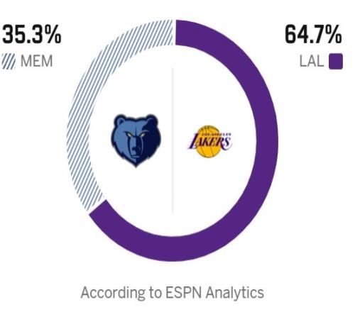 今天,ESPN预测本场比赛胜率,湖人64.7%,灰熊35.3%。