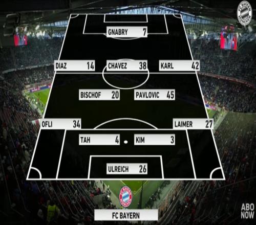 下半场比赛开始,拜仁轮换11人,换下凯恩、奥利塞等人,换上卡尔、迪亚斯、格纳布里等人。