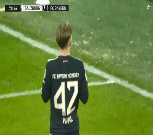 比赛第71分钟,卡尔破门后双手下压庆祝,拜仁2-0领先萨尔茨堡红牛。