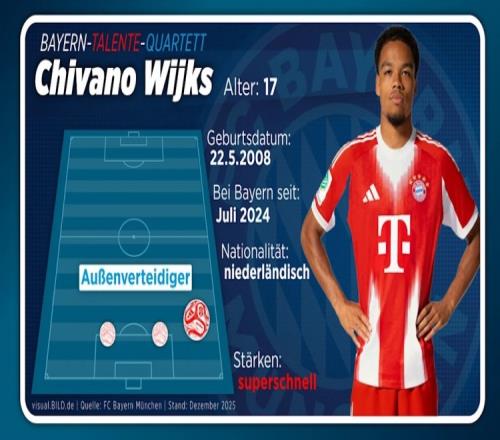 17岁的奇瓦诺·维克斯因其充满活力且稳健的球风闻名,让许多荷兰人想起了曾在2022年至2024年效力于拜仁的中卫德里赫特(现效力于曼联)。不过与德里赫特不同的是,维克斯在防守端并不局限于中路位置,而是能够灵活适应多个角色,他主要踢的是右后卫。在这个位置上,除了出色的运动能力外,他还能展现出惊人的速度,在拜仁U19队中,他的最高时速可达36公里。