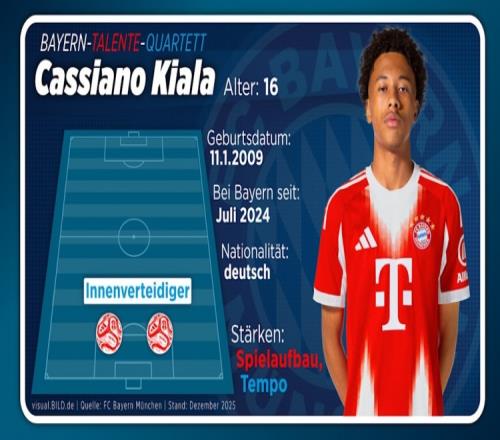 16岁天才后卫卡西亚诺·基亚拉在德甲的首秀引发诸多关注。这位身高1.86米的中后卫于2024年夏天从柏林赫塔转会至拜仁。作为德国U17国家队成员,基亚拉不仅以自信的球风著称,还拥有出色的速度。