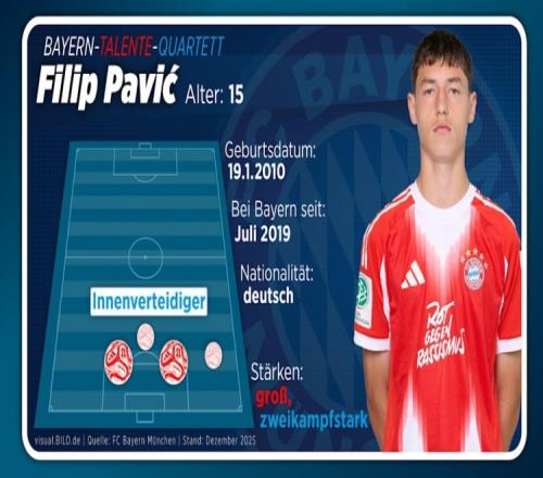 尽管只有15岁,但菲利普·帕维奇已随拜仁一线队训练。自九月起,这位U17中卫多次参加了主教练孔帕尼的训练课。帕维奇还是德国U16国家队的队长(出战6场比赛)。在12月初对阵葡萄牙体育的青年联赛中,他以15岁324天的年龄成为拜仁历史上第四年轻的出场球员。此前只有阿尔扬·伊布拉希莫维奇(现效力于海登海姆)、万纳尔(现效力于埃因霍温)和弗吕希特尔(现效力于莱切)比他更年轻。