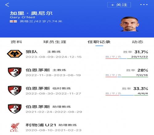 现年42岁的加里·奥尼尔拥有丰富的顶级足球赛事经验。这位曾经的进攻型中场球员在英格兰参加过500多场职业比赛。作为教练,他先后执掌伯恩茅斯和狼队,在英超联赛中执教了88场比赛。