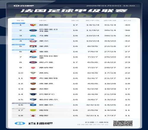 朗斯17轮法甲13胜1平3负,进31球丢13球,积40分排在法甲半程第一。13个丢球也是目前法甲最少。