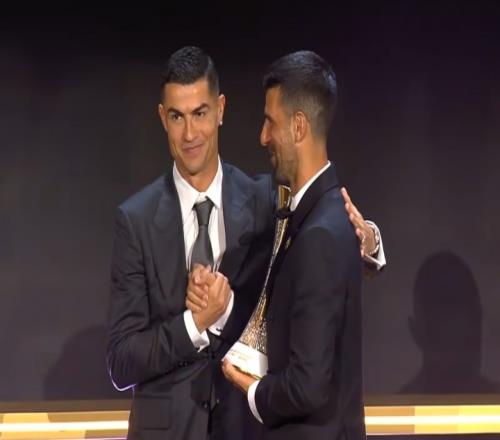 葡萄牙球星C罗在颁奖典礼现场为他颁奖,两人亲切握手。