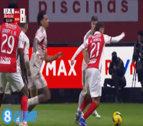 本菲卡遭反超!第45+1分钟,里奥斯禁区内停球失误送礼,维克托盘带连续摆脱两人后小角度扫射得手,布拉加2-1本菲卡!↓