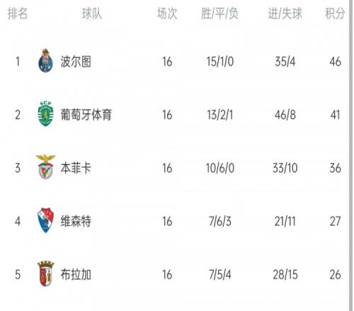 本轮过后,本菲卡10胜6平积36分,排名葡超第三位,波尔图15胜1平积46分居首。