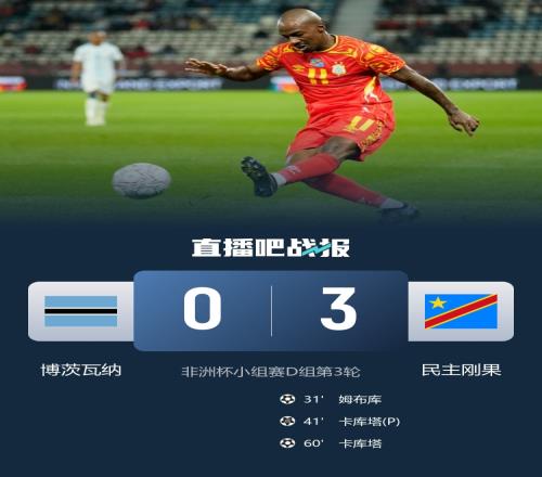 体育播报12月31日宣 北京时间12月31日凌晨3时,非洲杯小组赛D组第3轮,民主刚果对阵博茨瓦纳。上半场,卡库塔脚后跟助攻姆布库破门打破僵局,随后卡库塔点射破门扩大比分优势!半场战罢,民主刚果2-0博茨瓦纳;下半场,卡库塔再入一球完成梅开二度,布里斯头球破门,但因手球在先被吹。全场比赛结束,民主刚果3-0博茨瓦纳小组第二晋级!