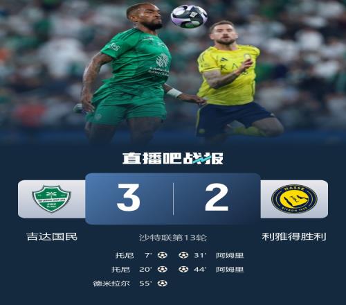 第55分钟,吉达国民禁区外右侧的任意球机会,皮球主罚到后点,伊万·托尼将球垫到门前,德米拉尔头球破门!吉达国民3-2再次领先利雅得胜利↓